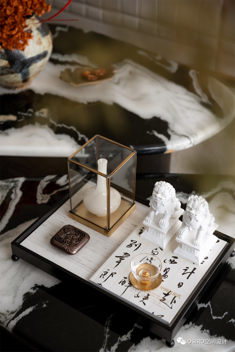 天津茶几的花艺,华丽端雅,生动却不俗艳。一发新枝斜立其中,明净摇曳的渗透与渲染,形成自然一体的宏伟画卷。不仅如此,电视墙的蕨类植物,太湖石无一不在述说着东方的诗意与雅致。