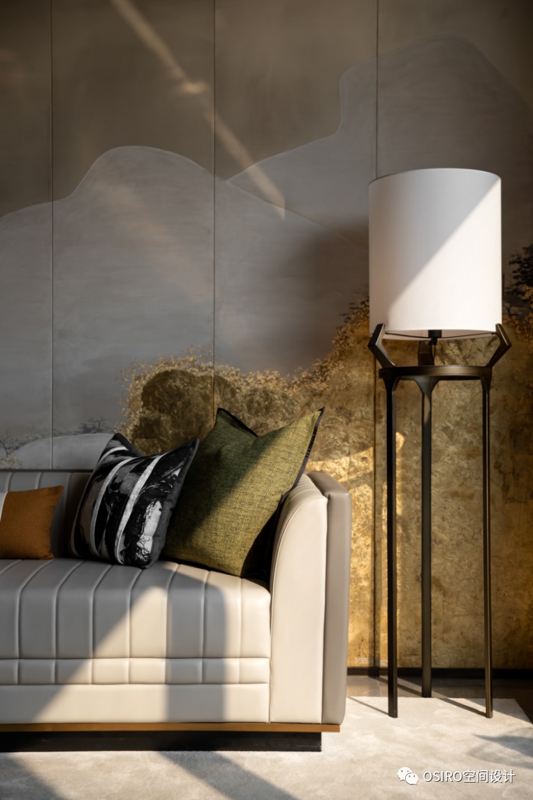 天津地毯,呼应背景墙的山水壁画,线条与朦胧的意象玩味出古代文人心中的禅意美。卧谷听松,主人的情怀亦在此处呈现。