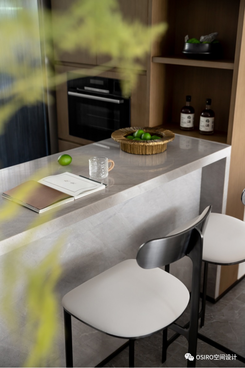 西厨岛台适时划分出厨房与就餐处,整个空间不至单调,行走动线也保持流畅。居者在准备食材时,还能和家人亲密共叙日常。
