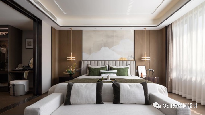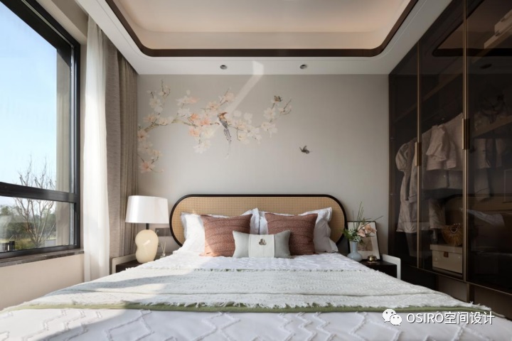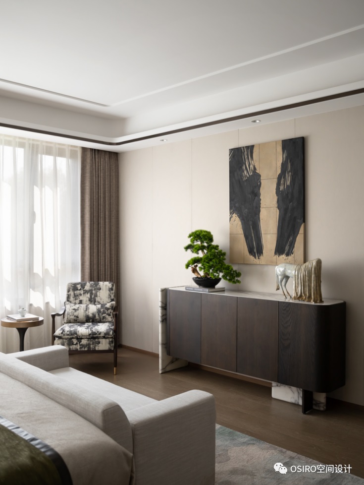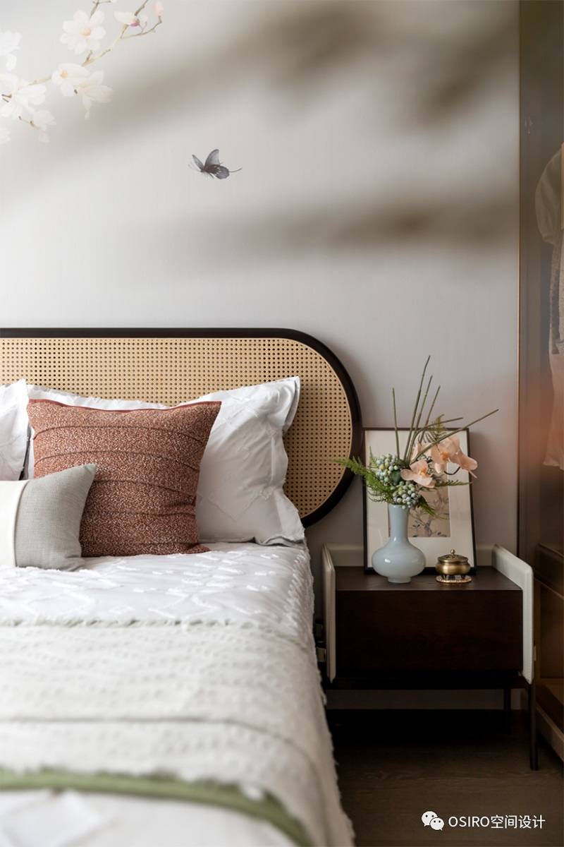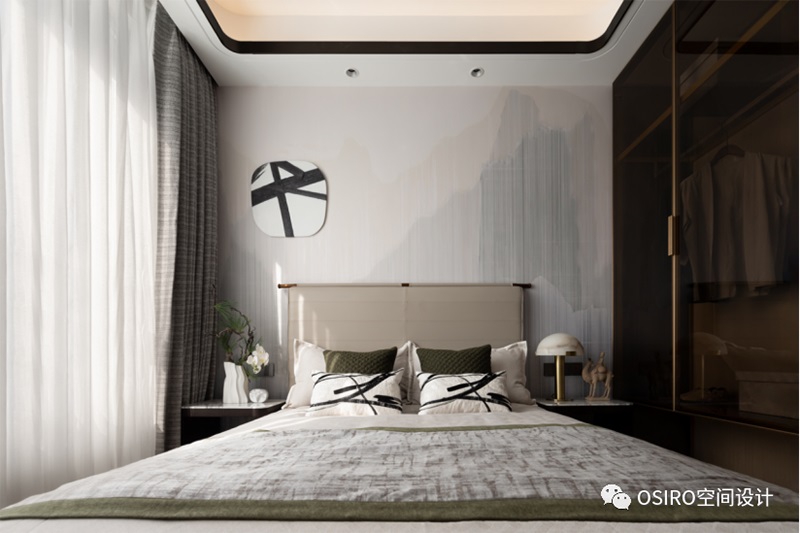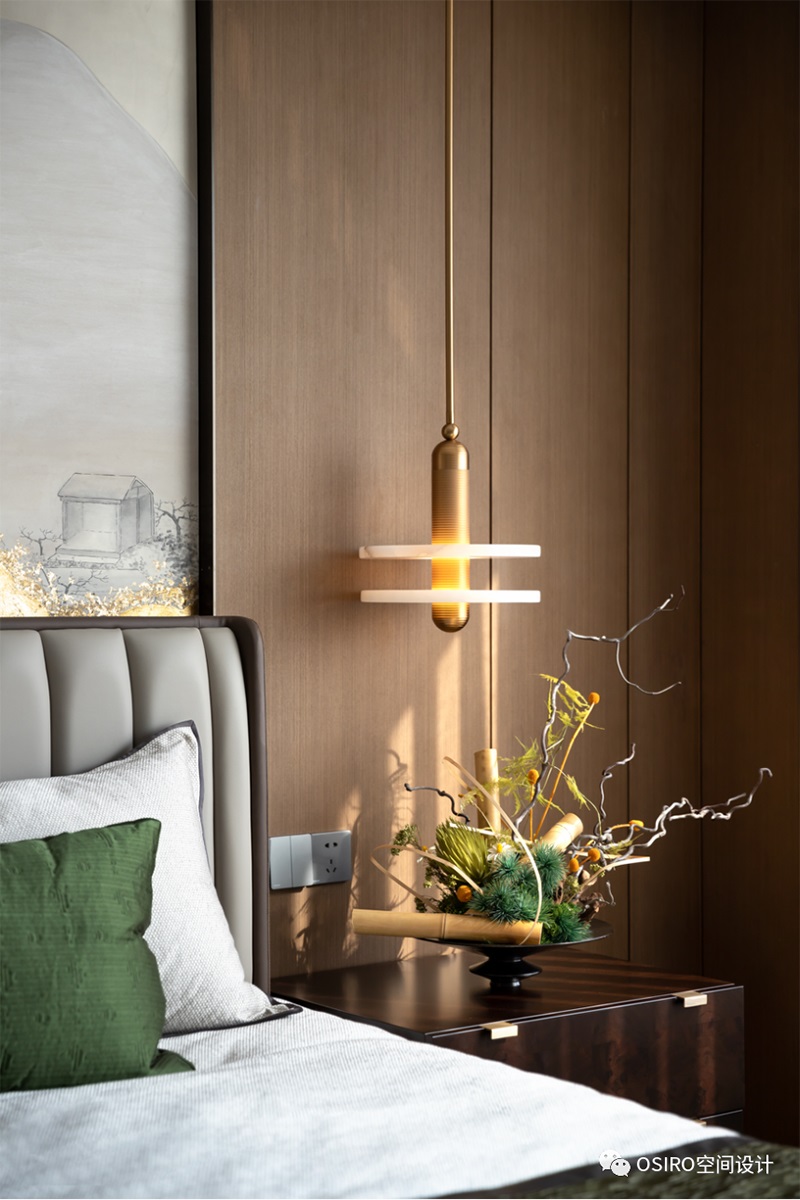 二层主卧延续了整个户型宋风雅韵的调性,以大方简洁、清逸淡雅,又极富东方感的简约陈设,阳光透过纱窗照射进来,增添层次感,丰盈抑或重塑居住者的内心秩序。