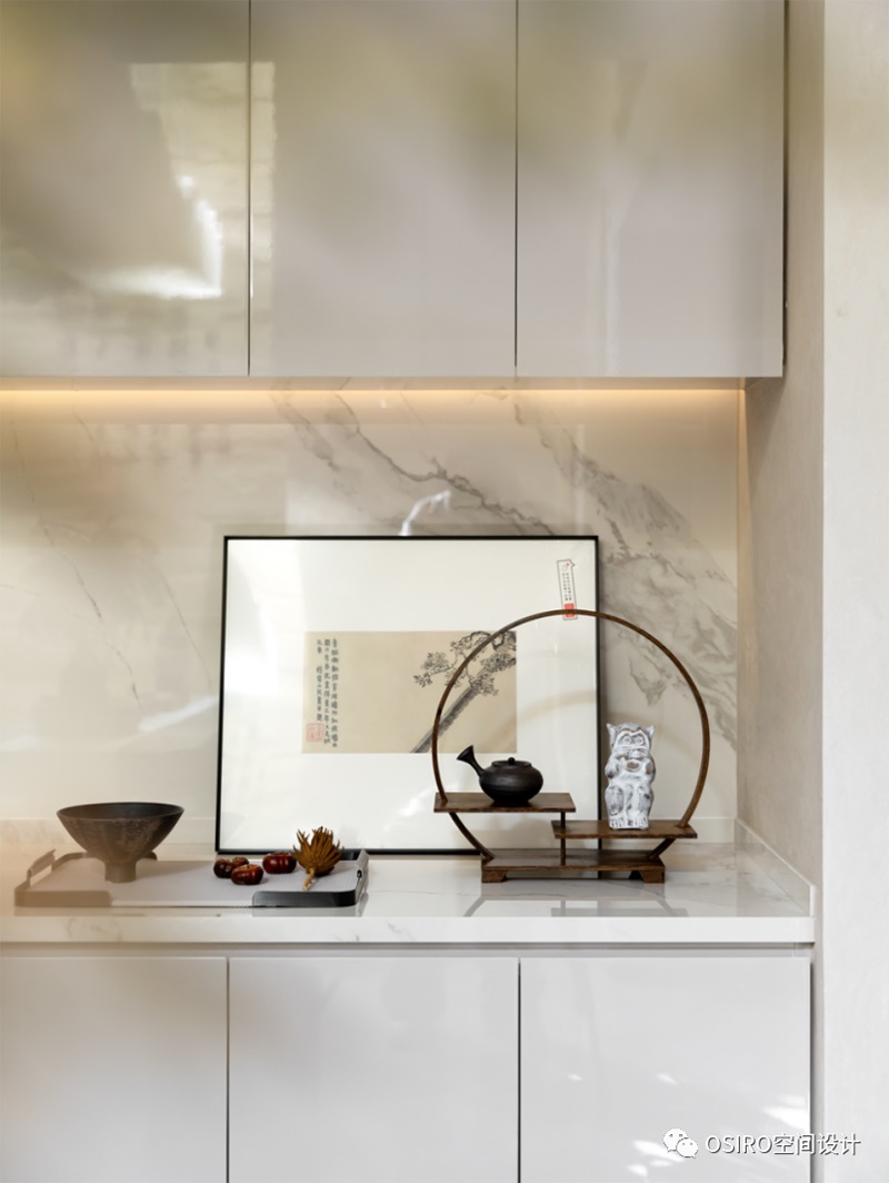 餐厅墙面的装饰画,远看东方近看无,喧嚣中的缄默,繁华里的无华,同时也是取”团圆”“圆满”之意,表达了国人对美好圆满生活的向往。