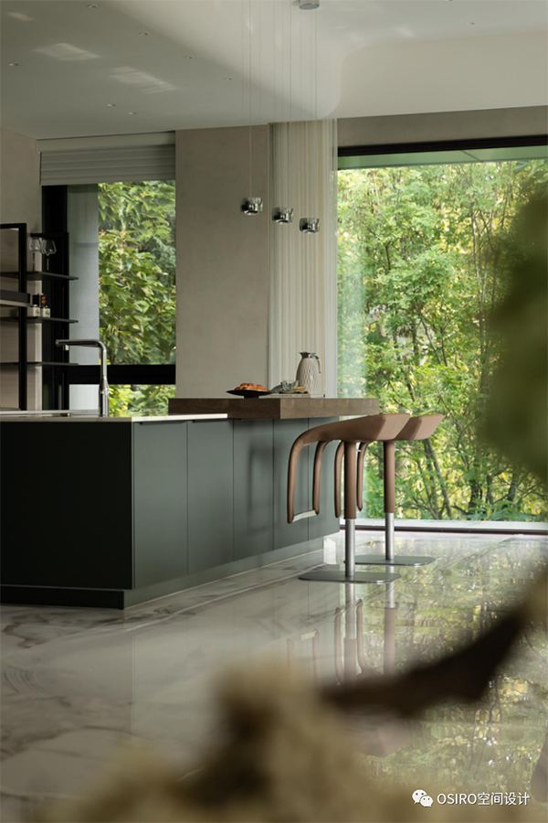 温润的木质岛台与精细雕琢的天然潘多拉石材餐台,对立中兼带和谐的美学。