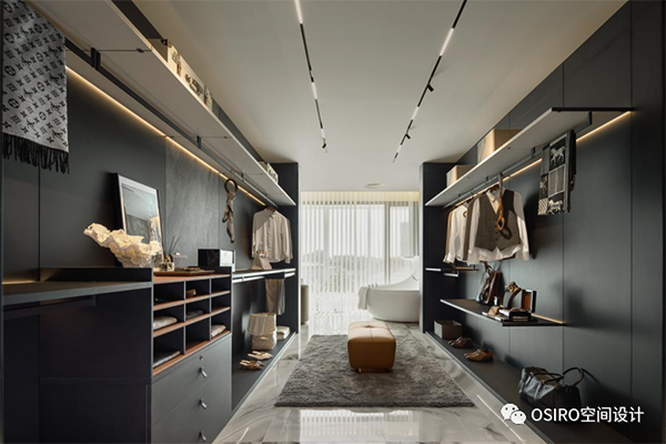 主卧衣帽间合理收纳男女主人日常的衣物鞋帽,采用了德国柏丽定制系统的N4整套壁挂系统,